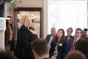 Beth Purvis, senior program director, education and character program for the Kern Family Foundation, speaks to the crowd gathered to celebrate the grant announcement.