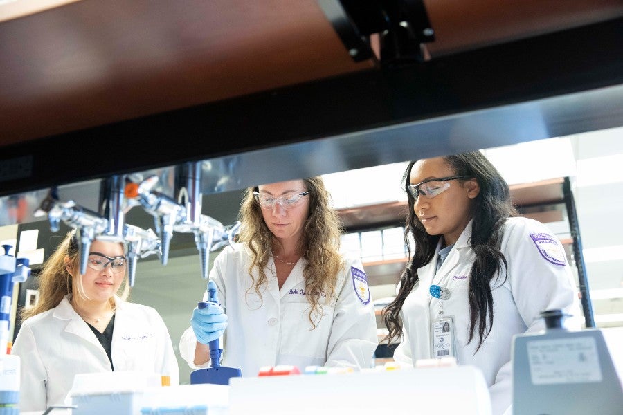 DR. RACHEL CROUCH (MIDDLE), WHO WON A NEW INVESTIGATOR AWARD FROM THE AMERICAN ASSOCIATION OF COLLEGES OF PHARMACY, WORKS WITH CAITHLYNE GUEVARRA, P3 (LEFT) AND CHRISTINE HUNTER, P4 (RIGHT) IN THE PHARMACEUTICAL SCIENCES RESEARCH CENTER